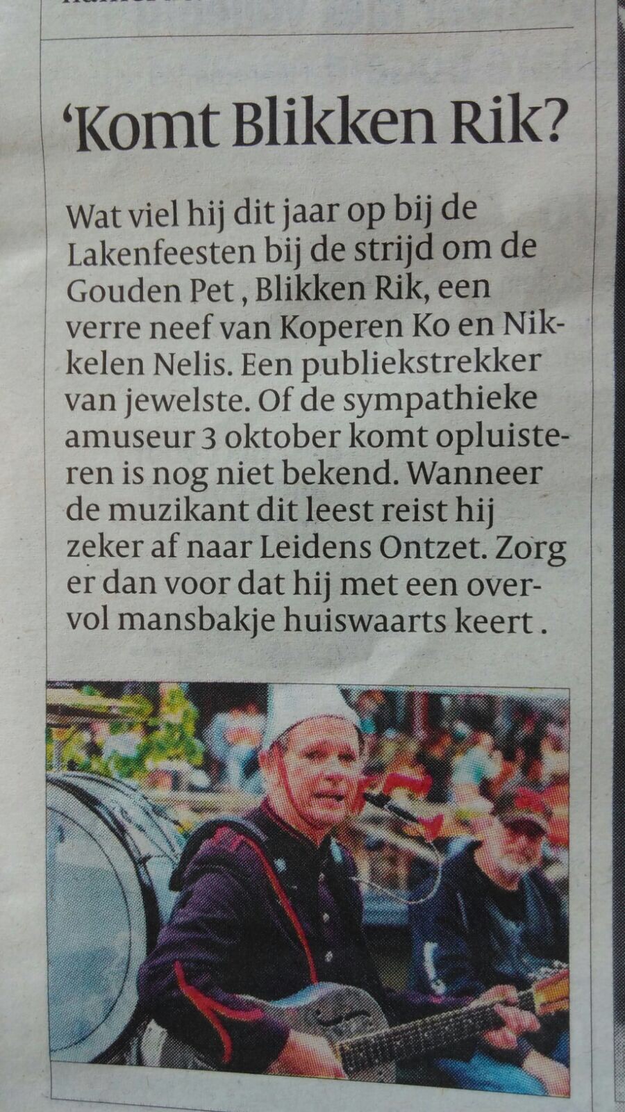 Al meteen wordt duidelijk dat deze muzikant (Blikken Rik) de S-factor heeft: hij is een echte straatmuzikant met hoofdletter ‘S’: gepassioneerd, vrolijk, origineel en muzikaal. Met steelse blikken en af en toe een grappige opmerking weet hij het publiek bij zijn optreden te betrekken. (Leidsch Dagblad 2017-06-26)