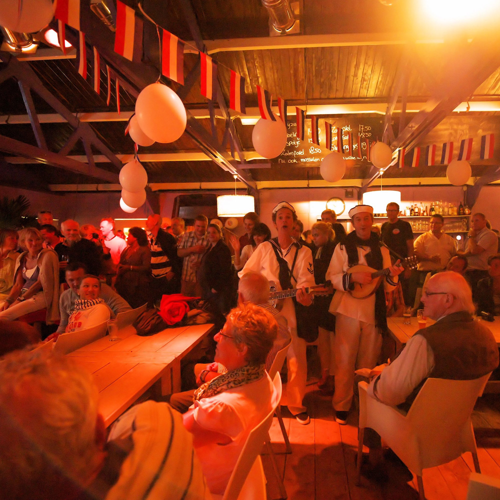 De akoestische muziek van de muzikanten overstemt nooit het samenzijn. Het geluidsniveau is op afstand plezierig en dichtbij prettig aanwezig.